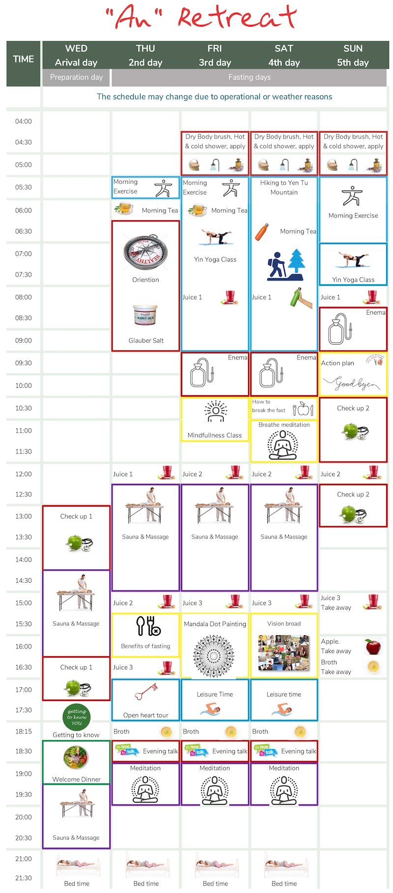 “An Retreat” at Legacy Yen Tu draws inspiration from the renowned Buchinger fasting method. We offer a comprehensive approach to health and well-being. Through fasting, mindfulness practices, and spiritual exploration, you will experience profound physical detoxification and mental clarity. “Ultimately”, this journey will lead you to a state of “An”, a deep sense of peace and balance.